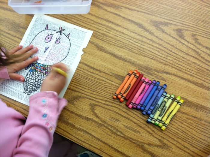 First, you need to tear out a page for each child. Be sure to scan each page for inappropriate words. Next, I showed them how to draw the owl in pencil. Then, we traced over it with a black marker.